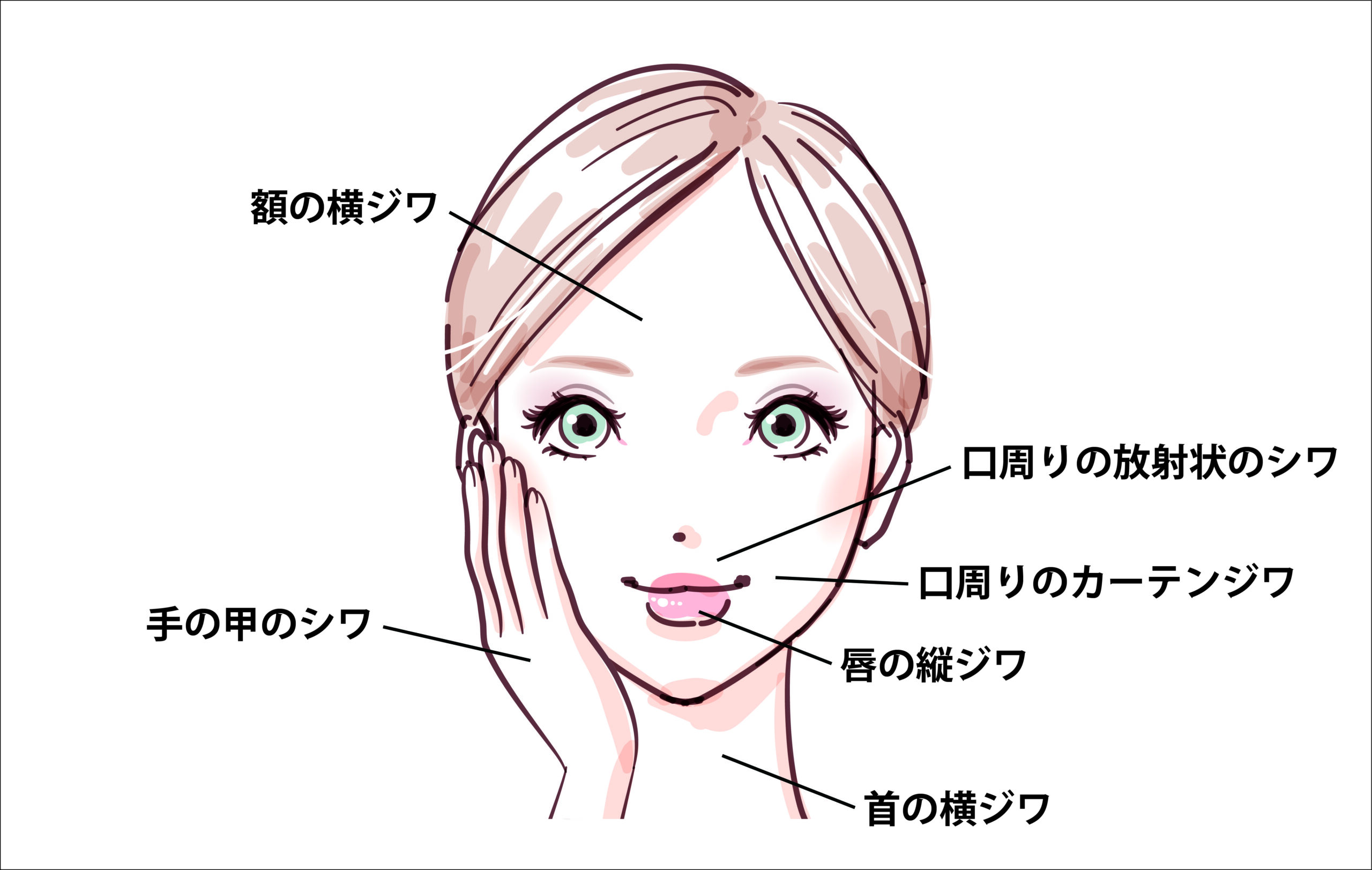 例えば、無表情でも目立つ額のシワや口周りのシワなど、ヒアルロン酸でボリュームロスを補いながら、ペプチドの効果でコラーゲン・エラスチンの生成を促進。肌にハリを与え、肌質の改善を促進します。また、ペプチド複合体のひとつ「sh-Pentapeptide-12 SP」が「筋肉の緊張を緩める」というボトックスと似た作用を持つため、シワの改善効果が期待できます。